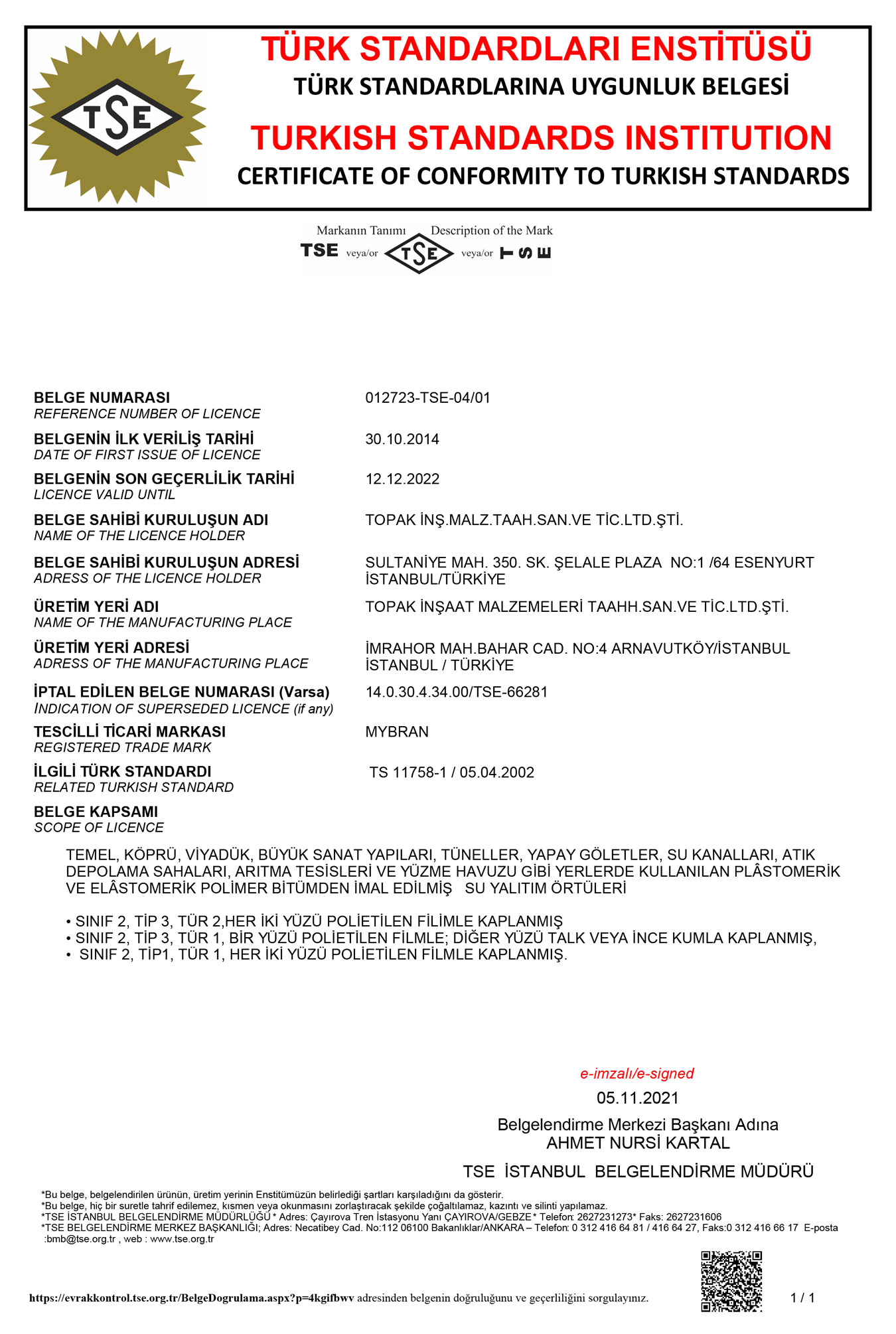 TS EN 11758-1 : Temel, Köprü, Viyadük, Büyük Sanat Yapıları, Tüneller, Yapay Göletler, Su Kanalları, Atık Depolama Sahaları, Arıtma Tesisleri ve Yüzme Havuzu gibi yerlerde kullanılan Plastomerik ve Elastomerik Polimer Bitümden imal edilmiş su yalıtım örtüleri.